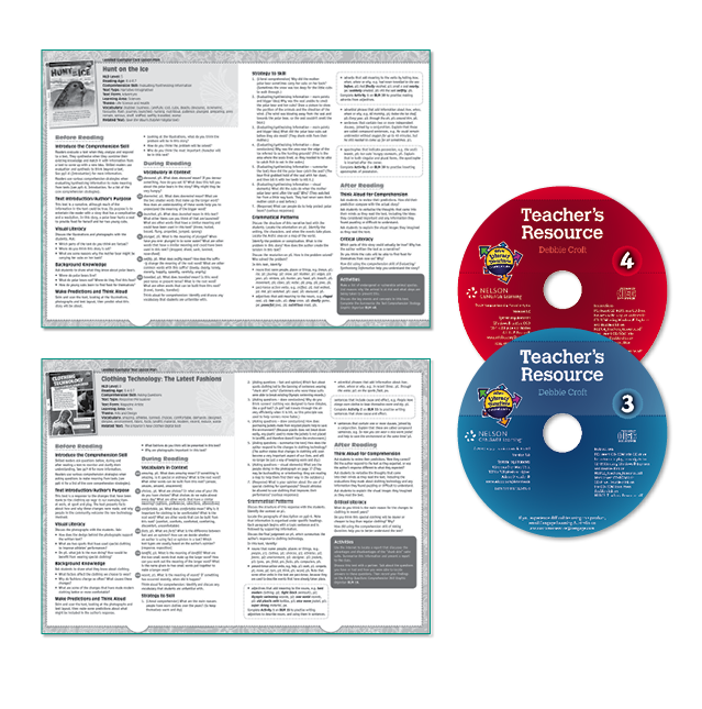 The Levelled Exemplar Cards provide carefully levelled fiction and non-fiction texts for guided and independent reading practice with a wide range of text types and text forms. There are six copies of 27 different cards in each Nelson Literacy Directions Box Set. Each Levelled Exemplar Card focuses on a core comprehension skill, which is labelled on the front of the card and reflected in the Strategy to Skill questions that are provided on page 6 of each card. The questions encourage readers to use various core comprehension strategies with the focus skill. Answers to the Strategy to Skill comprehension questions are available in the lesson plans on the Teacher's Resource CD-ROM.