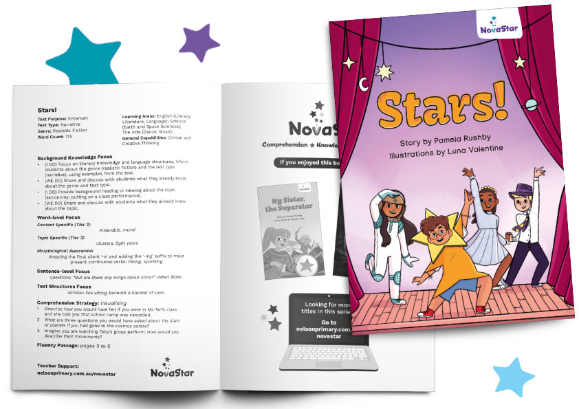 Detailed lesson plans follow the gradual release of responsibility model and include learning intentions and success criteria, alongside suggested approaches for teaching vocabulary, fluency, text structure and comprehension strategies.